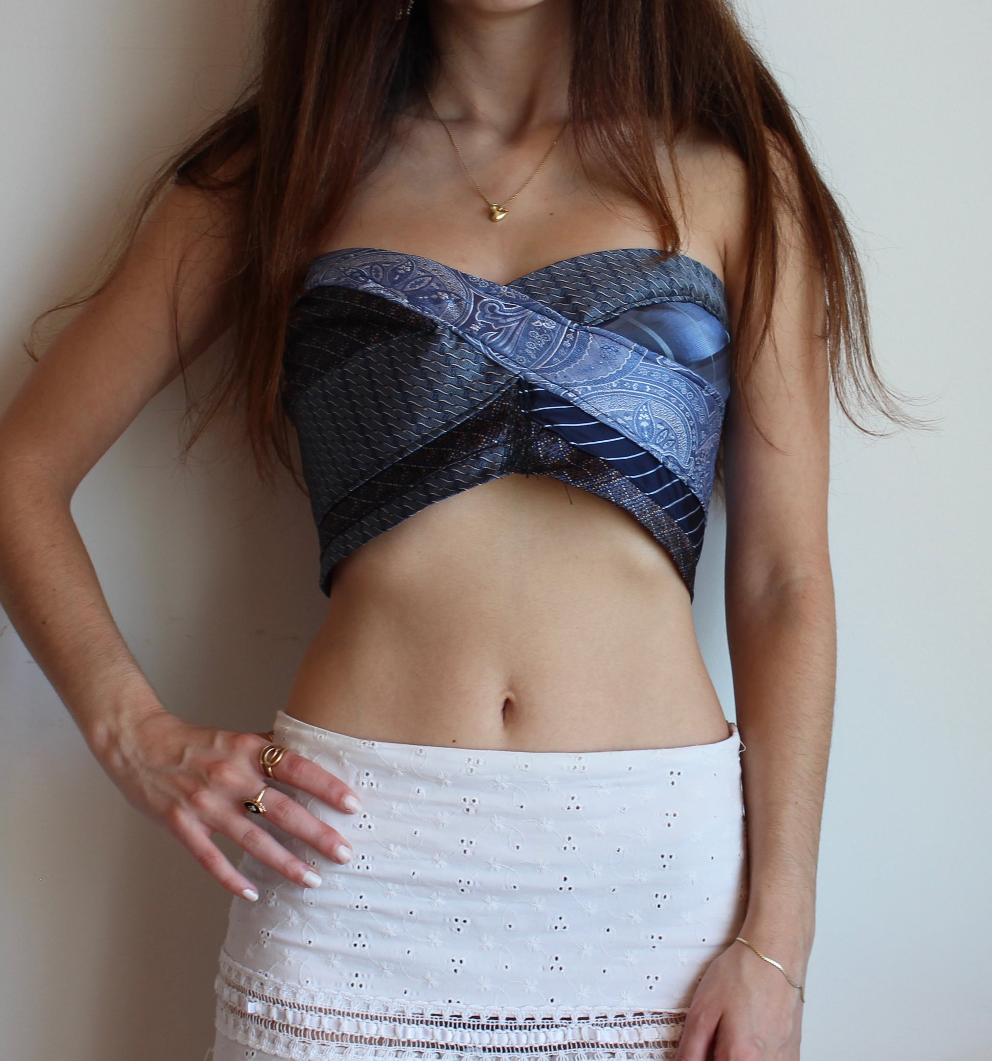 Crafted from discarded neckties and reimagined into a striking corset-style silhouette, this top tows the line between two eras . Each piece is made using secondhand ties, diverted from landfill and hand-assembled to celebrate both sustainability and self-expression. The lace-up back allows for an adjustable, sculpted fit—invoking the classic corset. One of one pieces, every one of the five limited edition tie tops are a one-of-a-kind statement against waste and for a future where fashion empowers, not exploits.