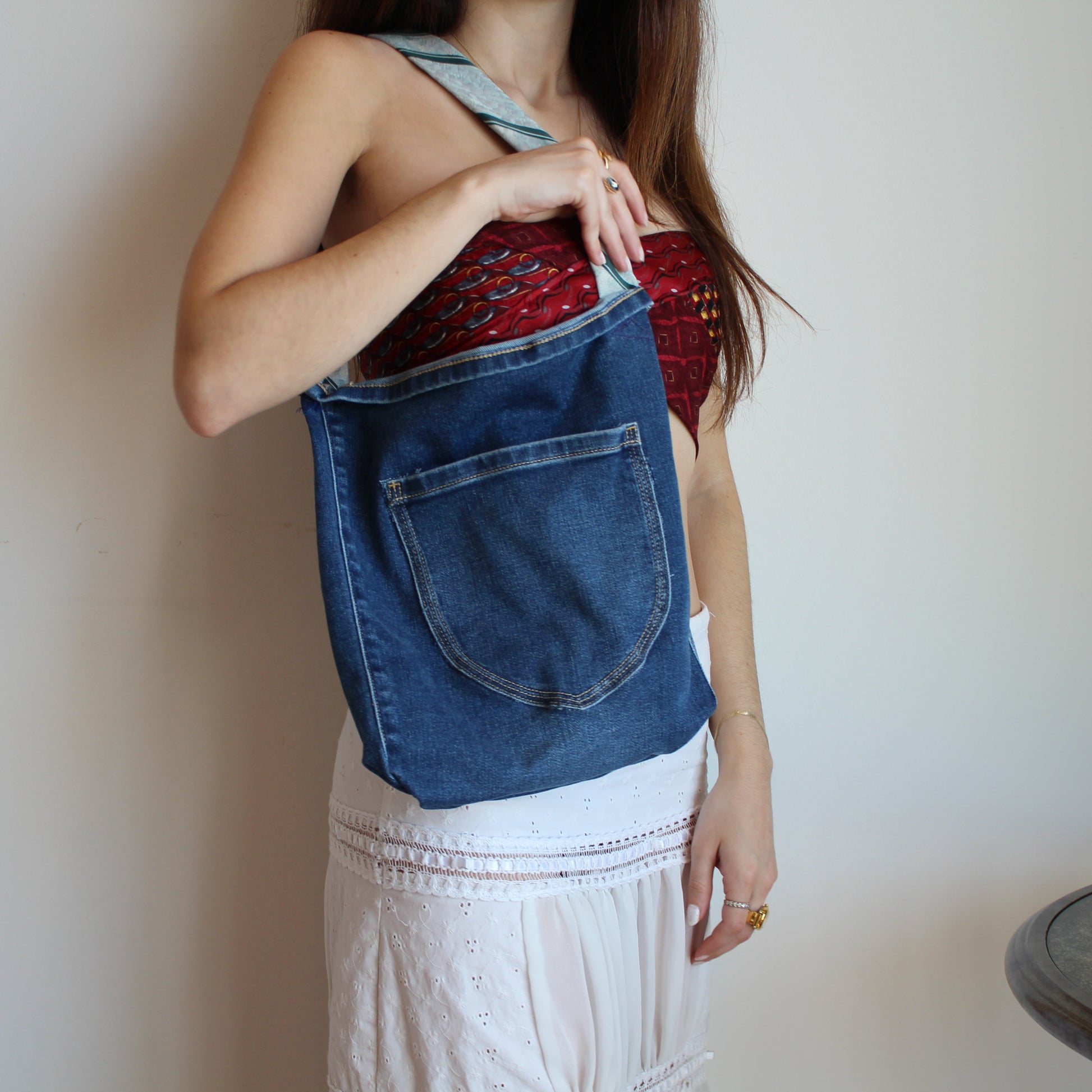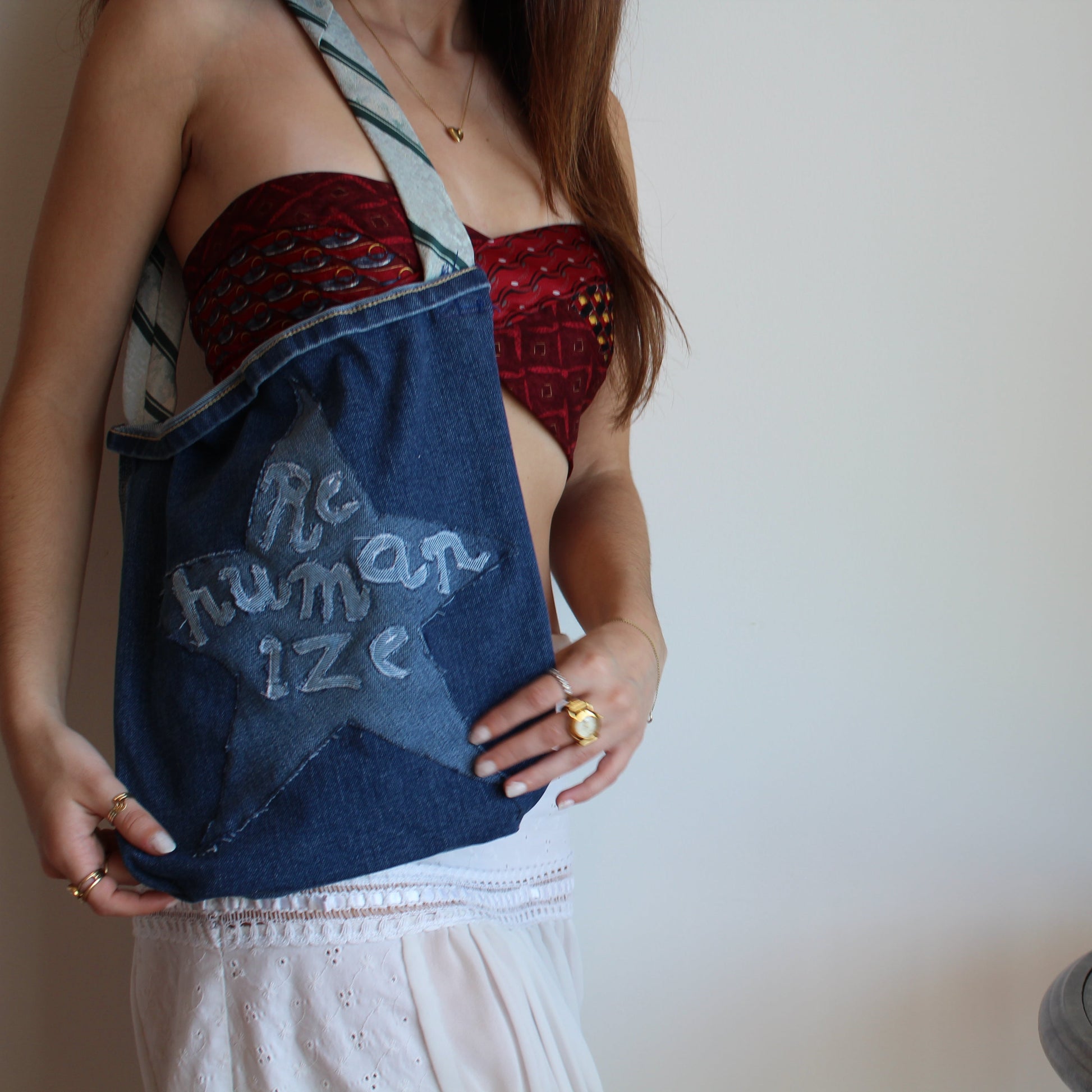 1 of 1 namesake tote bag crafted from upcycled denim with a vintage tie strap and external jean pocket! In a world of disconnection and dehumanization, introduce the idea of REHUMANIZATION to the world! Wear your values of repairing the relationship between humans & the planet and between fellow humans!